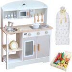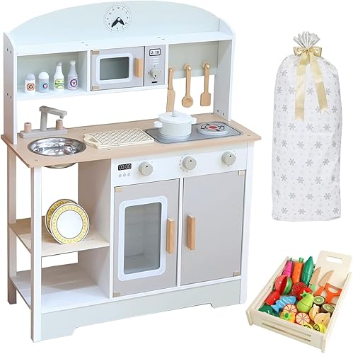 Rocottoの木製ままごとキッチンは、組立式で調理器具付き。知育玩具として楽しめるコンロ付きミニキッチンです。野菜セットとホワイトラッピング付きで、プレゼントにも最適。