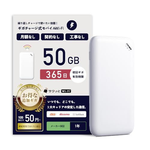 【サクッとWi-Fi】は50GBのデータを1年間利用可能なギガチャージ式ポケットWiFiです。契約返却不要で、月額費用なし。国内外で使えるSIMフリーのモバイルルーターで、電源ONですぐに利用開始できます。旅行に最適なプリペイドWi-Fiです。