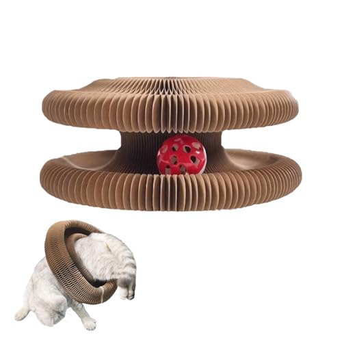 猫のスクラッチパッドとアコーディオンオルガンを組み合わせたおもちゃ。ベルボールとトラックで、インタラクティブに爪のケアができる。小型ペット向けの運動ゲーム。
