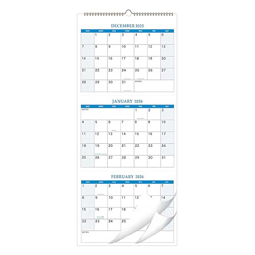 2026年の壁掛けカレンダー。3か月レイアウトで、マンスリーページは切り離し可能。計画オーガナイザーや四半期スケジュールに最適。ホームオフィスや冷蔵庫に便利。