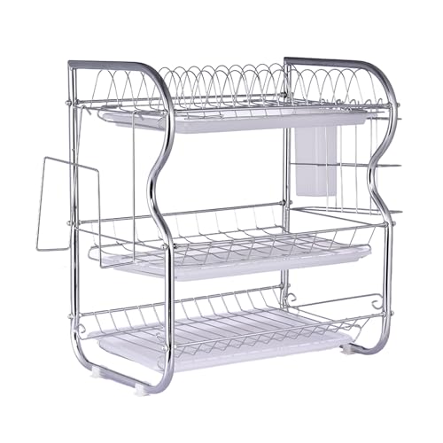 食器水切りラック3段。ステンレス鋼製で耐久性抜群。大容量のため、スタンディングカップやポットも収納可能。まな板ラックとカトラリーホルダー付き。サイズは40×43.5×25cm。家庭用キッチンに最適。