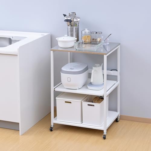 山善のレンジラックは、幅58×奥行45.5×高さ85cmで、ステンレス天板は耐熱200度。スライド棚や2口コンセント、キャスター付きで便利なキッチンワゴン。組み立て式。