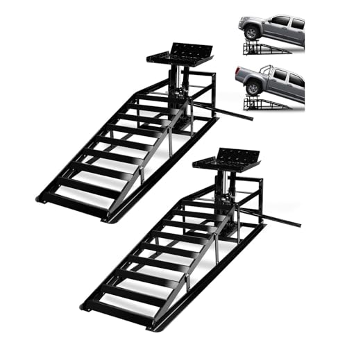 油圧カーランプ 2個セット、5トンの積載量。高さ23~36cm調整可能で、自動車やトラックのメンテナンスに最適。高耐久で低いプロファイルの設計が特徴。