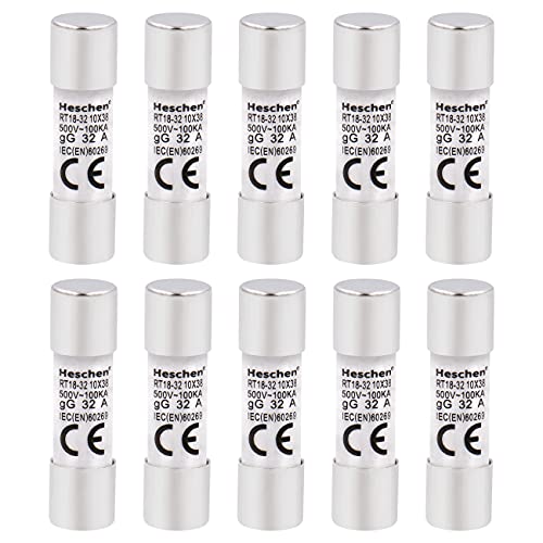 Heschen 円筒形セラミックチューブヒューズリンク RT18-32(RO15)は、10個入りの32A、400V用で、サイズは10 x 38mmです。CE認証を取得しており、信頼性の高い電気保護を提供します。