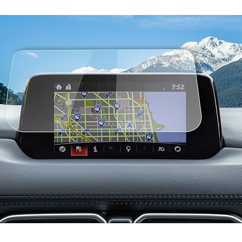 RUIYA製のマツダCX-5/KF系とCX-8/KG系前期用ナビ保護フィルム。7インチ強化ガラス製で、高タッチ性能、キズ・汚れ防止、9H硬度、飛散防止機能を備えた自己吸着タイプです。