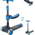 RideVOLOの子供用キックスクーターは、三輪デザインで安定性抜群。高さは62/74/81cmに調整可能。光るLEDタイヤ、折り畳み式、方向変換機能付き。耐荷重50kgでアウトドアに最適。