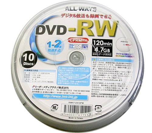 ALL-WAYS DVD-RWCPRM対応4.7GB繰り返し録画用ワイドプリンタブル1-2倍速スピンドルケース10枚入り RW47-2X10PWの製品情報