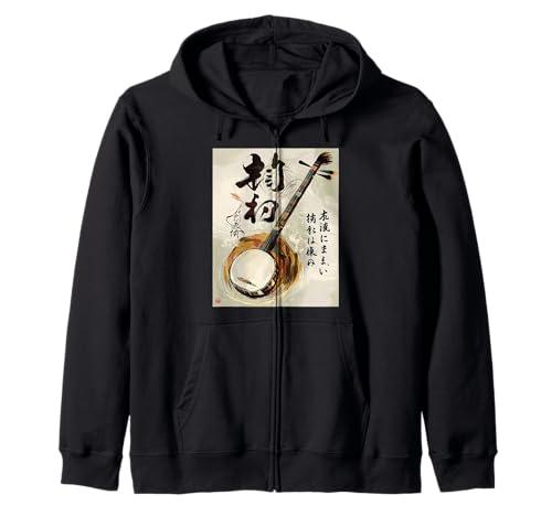 三味線をモチーフにした伝統音楽デザインの和楽器ジップパーカー。日本の美術の美しさを融合させた一着で、普段使いから特別な場面まで対応。柔らかな素材感とスタイリッシュなシルエットが特徴。
