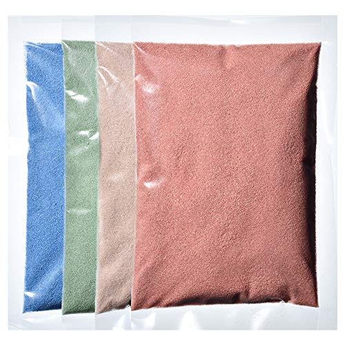 カラーサンドの4色セット(ライトブルー、ライトグリーン、クリーム、ダークサーモン)。各150g、細粒(0.2mm程度)で、Sタイプ。日本製で、 decorative arts や DIY に最適です。