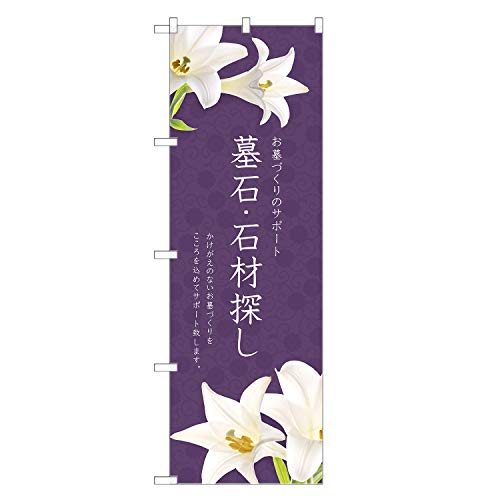 「アッパレ!! のぼり旗 墓石 石材探し」は、レギュラーサイズで左チチ仕様ののぼり旗です。四方三巻縫製で耐久性に優れ、屋外での使用に適しています。品番はS06-0024C-Rです。
