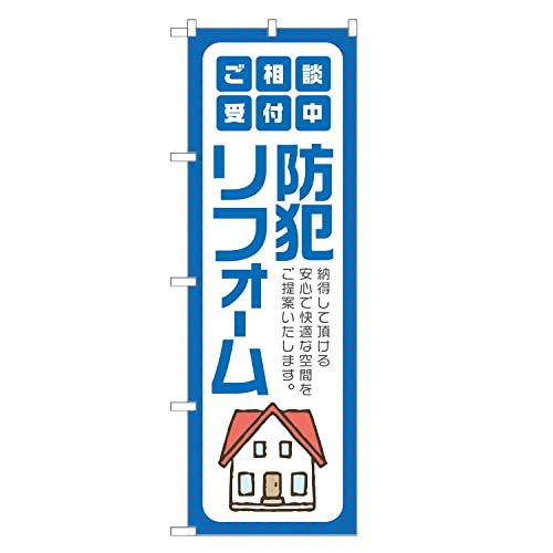 アッパレ!! のぼり旗 防犯リフォーム(青、レギュラー、左チチ)は、四方三巻縫製仕様で耐久性に優れ、屋外での使用に最適です。サイズやデザインが豊富で、店舗やイベントなどで注目を集めることができます。