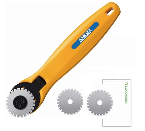 オルファ ロータリーカッター28は、28mmの刃で精密な裁断を実現。替刃2枚付きで長持ち。ロコネコカード(ミシン目)の特典つき。手芸や裁縫に最適な工具です。
