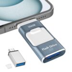 256GBの4in1 Phone USBメモリ。アプリ不要でアルバムから直接写真保存可。iOS、Type-C、USB、Micro USB対応。大容量で高速データバックアップ。スライド式で携帯性抜群。