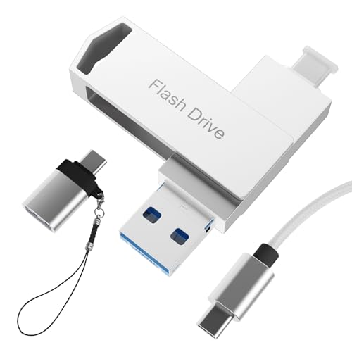 512GB Phone USBメモリ 【アプリ不要・アルバムからデータ保存】4in1 USBメモリ 写真保存 大容量 外付けメモリ 高速 データバックアップ フラッシュメモリ iOS/USB/Micro USB/Type-C 外付けストレージ 回転式 スマホ容量不足解消 USB-C ケーブル ストラップ付 シルバー 高価買取中