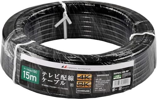 日本アンテナの15mアンテナケーブル(モデルS5FBAL15B-RP)は、4K8K、地デジ、BS、CS、CATVに対応。高品質なS5CFB同軸ケーブルを使用し、ブラックカラーでスタイリッシュなデザイン。