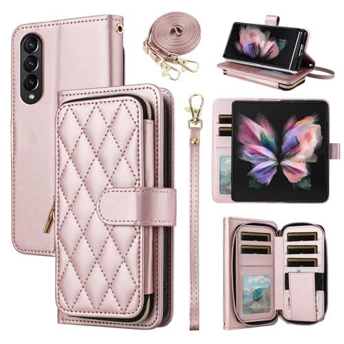 ElisorliのSamsung Galaxy Z Fold 3 5G対応ケース。ショルダーストラップ、カードスロット、ジッパー付き。スタンド機能もあり、ローズゴールドのデザインが魅力的です。