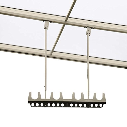 三協立山アルミのテラス用吊下げ型竿掛けSATV-03K-2は、ブラックの標準タイプです。調整範囲はH=575mmから983mmで、1セットに2本が含まれています。