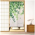 のれん 暖簾 おしゃれ リーフ柄の間仕切りカーテン。ロングタイプで目隠し・遮光効果あり。玄関や階段、廊下、リビング、脱衣所、お風呂など多用途で利用可。プライバシー保護に最適。サイズ: 幅85cm, 丈150cm (グリーン葉っぱ)。