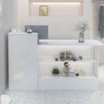 木製の無垢材を使用した受付カウンターテーブルです。業務用や小売り、ショールームに最適。ホワイト右仕様でサイズ150cm、スタイリッシュなデザインが特徴。