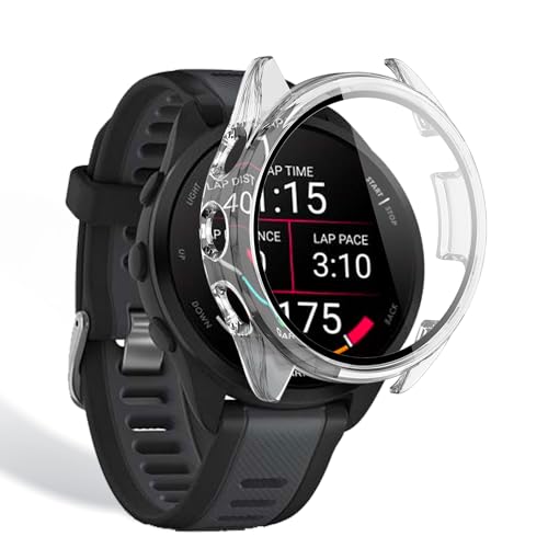 ガーミンForerunner 165/165 Music用の一体型ケース。PCと強化ガラスで全面保護。超薄型で装着簡単、耐衝撃・防塵性能あり。高透過率でクリアな視界を保つ。