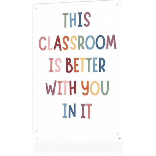「This Classroom Is Better With You In It」ボホスタイルのメタルサイン。8×12インチサイズで、高校・小学校・中学校の教室にぴったりの壁装飾。教育現場に温かみを加えるデザイン。