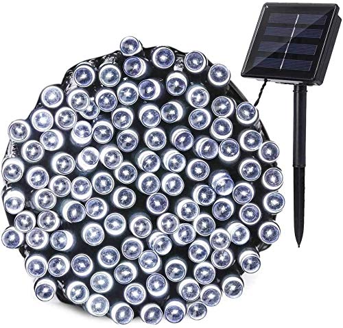 屋外用ソーラーイルミネーション、20mで200球。防雨仕様、8パターン点灯機能とメモリー機能付き。クリスマスツリーやガーデン装飾に最適。ホワイトライト。