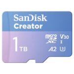 SanDisk 1TB Creator microSDカードは最大190MB/秒の転送速度を誇り、カメラやドローンでの4K/5.3K撮影に最適です。A2 V30 U3対応、Adobe Lightroomが3か月間付属しています。