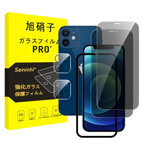 iPhone 12 mini対応の覗き見防止ガラスフィルム2枚、レンズ保護フィルム2枚付き。硬度9Hで耐衝撃、飛散防止機能。自動吸着、気泡ゼロ、指紋防止で操作性も良好。