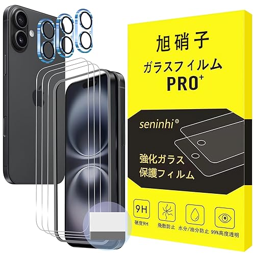 iPhone 16用ガラスフィルム3枚セット。高硬度9H、スムーズなタッチ感、気泡防止設計。指紋耐性あり、クリアな視界を実現し、しっかり保護します。簡単装着で安心のフィット感。