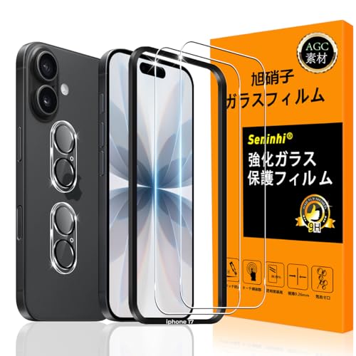 iPhone 17用のガイド枠付き強化ガラスフィルム2枚セット。国産旭硝子素材使用で、撥油性、高光沢、超薄型。硬度9Hの耐衝撃性、指紋防止、気泡なしで簡単貼り付け。