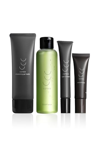 curocoトータルケア4点セットは、薬用アイクリーム、レチノールクリーム、薬用CICAハトムギ化粧水、ホットクレンジングバームを含むスキンケアセットです。肌に優しく、しっかりと保湿・修復します。