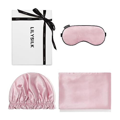 LILYSILKのシルクビューティー3点セットは、100%ムルマシルクを使用し、アイマスク、全周ゴムナイトキャップ、43x63cmの枕カバーが含まれています。高級感溢れるバラピンクはギフトにも最適です。