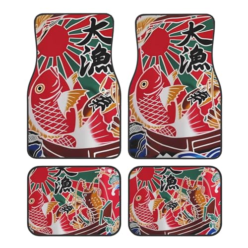 車用フットマット 大漁旗 4点セットは、新品で耐久性に優れた素材を使用。汚れに強く、お手入れも簡単。車内に鮮やかな大漁旗デザインで個性をプラスします。サイズは標準的で、多くの車種に適合します。