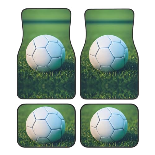 芝生の上に緑のサッカーボールデザインの4点セットフットマット。SUV、トラック、セダンに適したユニバーサル仕様で、フロントとリアに対応します。