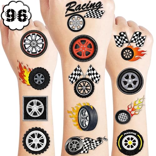 100個のホイール・タイヤ・チェッカーフラッグデザインの一時的なタトゥー。誕生日パーティーや学校のデコレーション、賞品に最適!男の子・女の子向けのレースカー themedギフト。