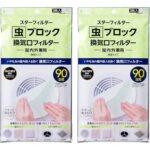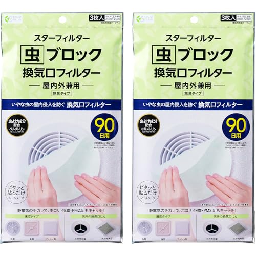 虫ブロックの換気口フィルターは、21x21cmのサイズで、屋内外兼用の防虫・防塵対策に最適です。貼るだけで簡単に使え、PM2.5の侵入を防ぎます。3枚入りで、2袋セット。