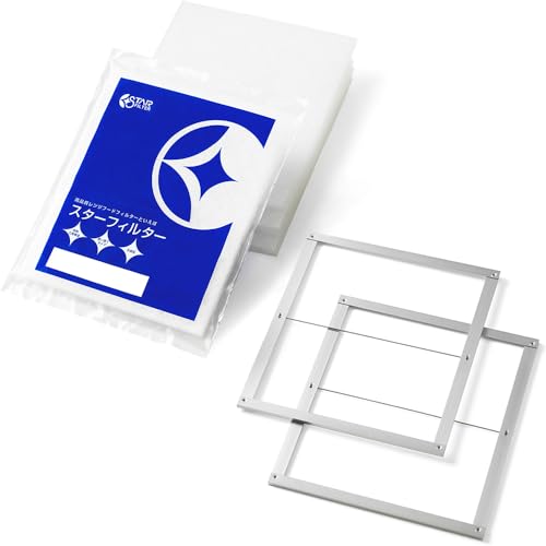 スターフィルターの換気扇フィルターは、レンジフード用のスターターセットです。取付枠2枚と交換フィルター4枚が含まれ、不燃性で高い除去率のガラス繊維タイプ。サイズは横297×縦297×厚7mmです。