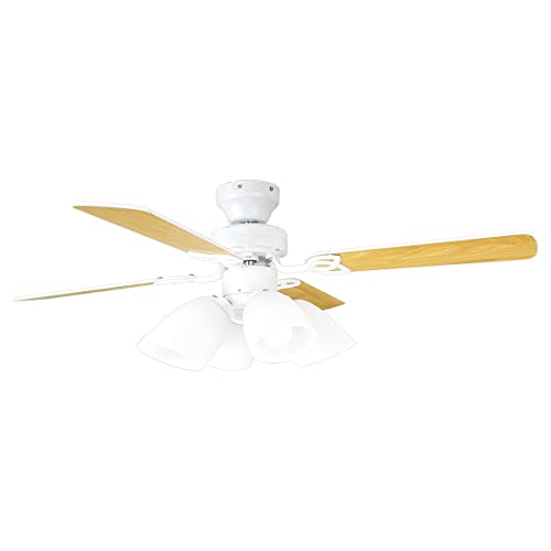 クラシックデザインのシーリングファンライトで、4灯のE26ソケット、4枚羽根。赤外線リモコン付き、ホワイトボディにナチュラル羽根。LED電球(5000K)4個セット。メーカーはリュウド(新潟県十日町市)。