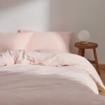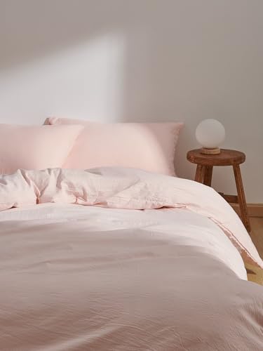 クモリの寝具カバーセットは、掛け布団カバー、ボックスシーツ、枕カバーの4点セットで、洗いざらしのシワ加工が特徴。吸水速乾、肌に優しい素材でオールシーズン使用可能。色はシンプルなピンクで、セミダブルサイズです。