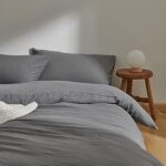 クモリの寝具カバーセットは、洗いざらしのシワ加工とやわらかな素材が特徴です。吸水速乾で丸洗いOK、肌に優しく無地のシンプルデザイン。オールシーズン対応のシングルサイズ(3点セット:掛け布団カバー、ボックスシーツ、枕カバー)。カラーはダークグレー。