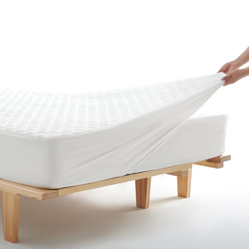 クモリ(Kumori) パッド一体型ボックスシーツは、シングルサイズ(100x200cm)で洗いざらしの柔らかいピーチスキン素材。耐久性が高く、吸湿速乾、抗菌防臭加工済み。オールシーズン使用可能でズレにくく、着脱簡単で洗えるのが特徴です。