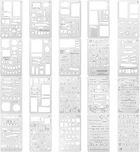 20枚入のテンプレート手帳用ステンシルシートです。DIYアルバムや描画に最適な製図用プラスチック素材。サイズは10x18cmで、画材や手芸に活用できます。