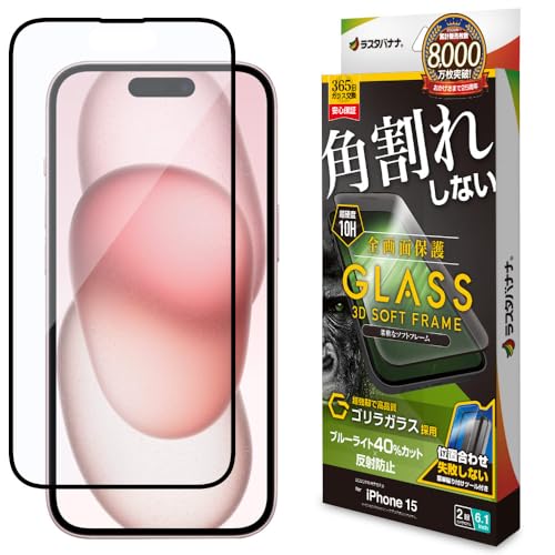 ラスタバナナのiPhone15専用ガラスフィルムは、全面保護設計でブルーライトカット機能付き。反射防止効果があり、耐久性に優れたゴリラガラスを使用。厚さ0.25mmで快適なタッチ感を提供します。