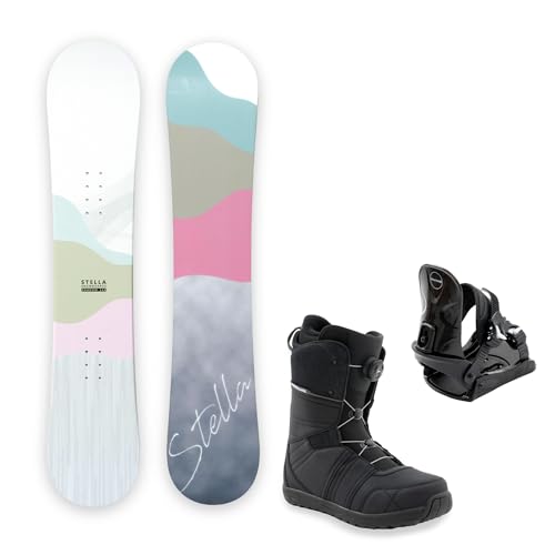 スポイチのスノーボード3点セット。板は144cmのホワイト、バインディングはブラック、ブーツはA-TOPの23.5cm。デザインはシンプルでスタイリッシュ、レディース向けに最適です。