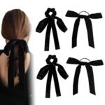 Shidaraのラグジュアリーベルベットボウヘアタイ4個セット。エレガントなロングテールリボンで、髪のスタイリングに最適。伸縮性のあるデザインで使いやすく、結び目やツイストが可能な髪飾りです。