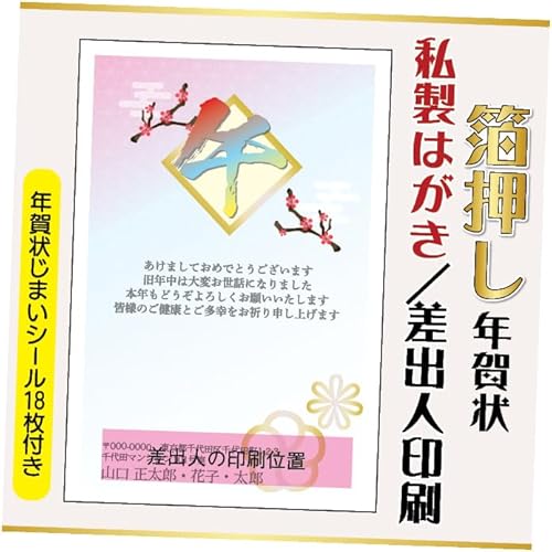 箔押し年賀状 私製はがき【20枚】文章印刷済み。年賀状じまいシール付で、差出人印刷を込みで提供します。印刷される差出人住所はご注文時の「お届け先住所」と「氏名」を使用します。デザインはhakuoshi18。