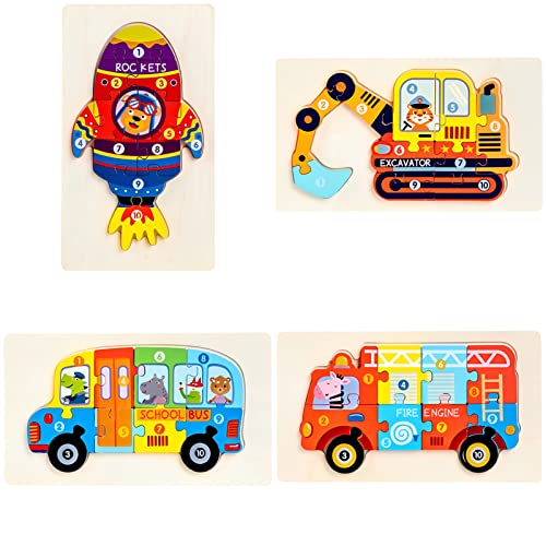 木製パズル4枚セット。知育おもちゃとして、乗り物や動物をテーマにした楽しいパズル。2-6歳の赤ちゃんや子供向けで、入園お祝い、誕生日、クリスマスに最適な人気アイテム。