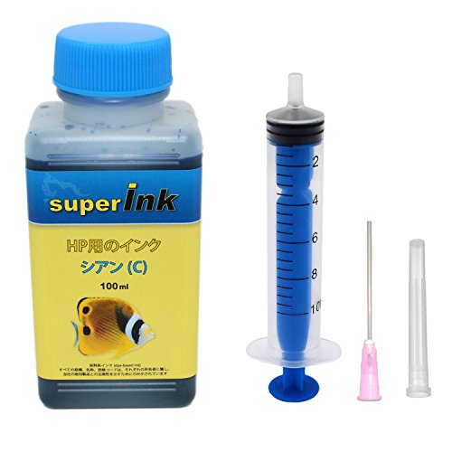 HP用シアンの詰め替え互換インク100mlです。全機種対応で、手袋1組、10ml注入器、針、キャップが付属しています。便利なセットでインク交換が簡単に行えます。