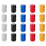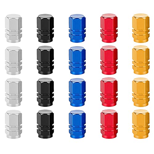 タイヤバルブステムキャップ20個セット。アルミニウム製で、ガスケット付き。バイクやトラック、スクーター、ベビーバギーに対応。色はブラック、シルバー、レッド、ゴールド、ブルーがあります。