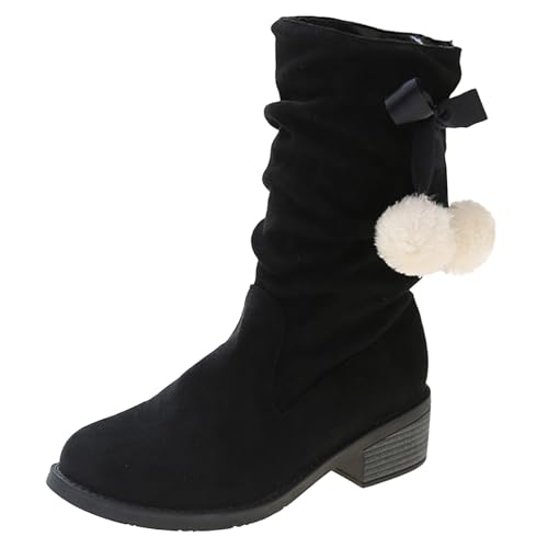 クリスマスブーツ、レディーススエードスノーショートブーツ。赤、黒、ワインレッド色。フリースボールとリボンデコ付き。レトロなチャンキーヒールで可愛く、冬や雪用のおしゃれな外出靴。サイズ: 37。